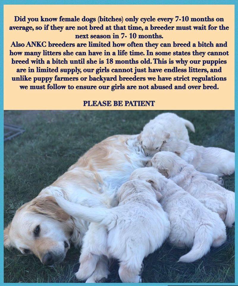 At the moment the club and breeders are being inundated with enquiries about Golden Retriever puppies. Unfortunately,there are no puppies at the moment and probably won’t be until after September or even later in the year. Our suggestion is you start looking at that time.