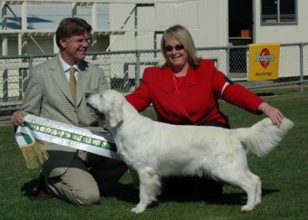 GOLDLAKE SUMMER BREEZEFirst—Beautiful young bitch who is shown to advantage with a waggy tail. Well chiselled head, lovely expression, excellent neck. Good front angulation. Excellent bone and feet. Good ribs but needs more depth of body. Would prefer more level back when moving. Strong quarters with good second thigh. Moves with great extension and drive. Correct coat texture but not in full bloom today. Well handled and presented.